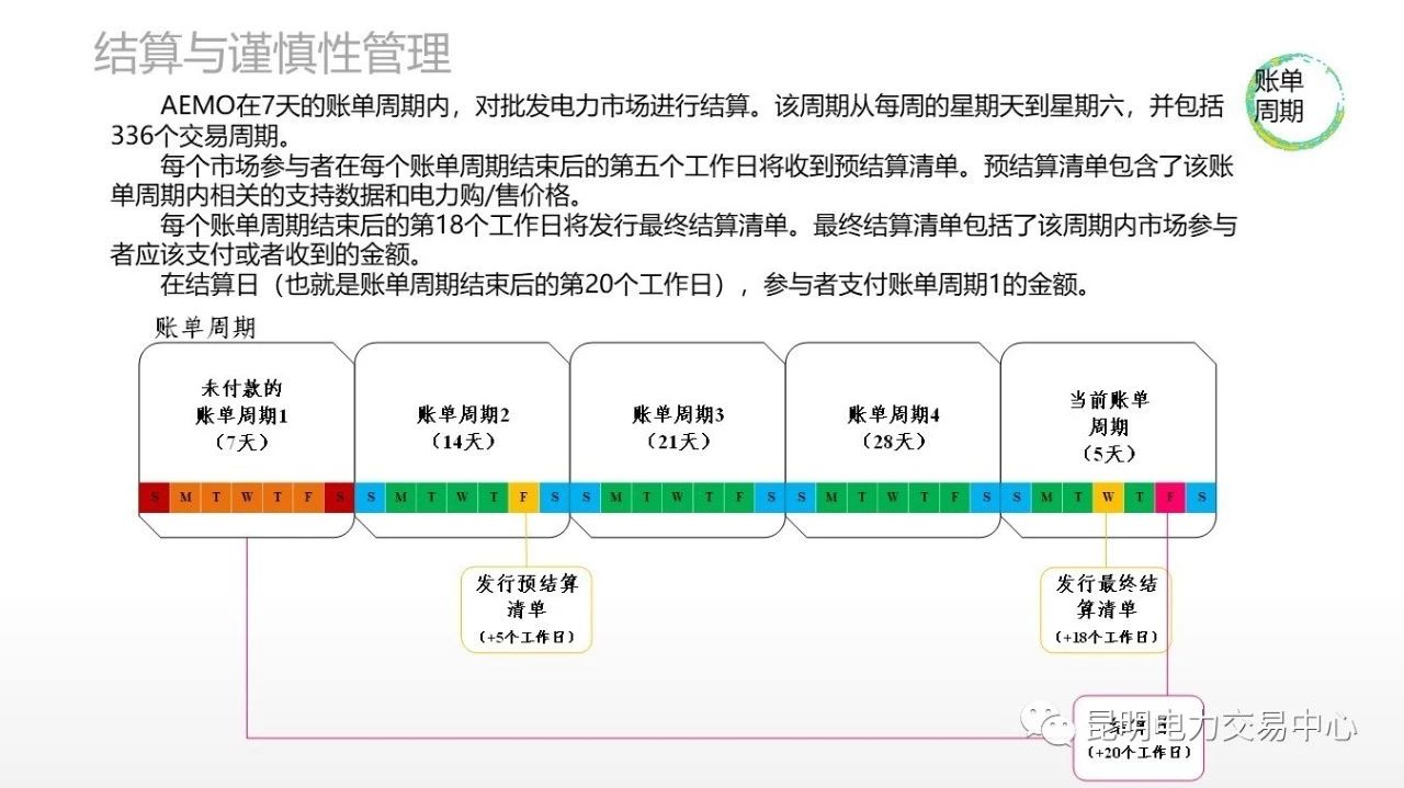 有機的“交易-計量-結(jié)算”協(xié)調(diào)配合機制。澳大利亞國家電力市場是一個電力現(xiàn)貨批發(fā)市場,調(diào)度周期為5分鐘,交易周期為30分鐘,按周進行結(jié)算,交易-計量-結(jié)算的協(xié)調(diào)配合使得市場運行較為順暢。