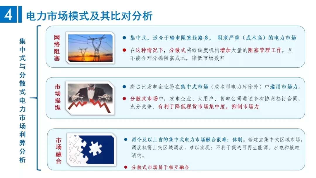 集中式和分散式哪種模式的電力市場(chǎng)效率更高,不能一概而論,主要取決于電力體制、電網(wǎng)結(jié)構(gòu)和電源結(jié)構(gòu)及市場(chǎng)結(jié)構(gòu)