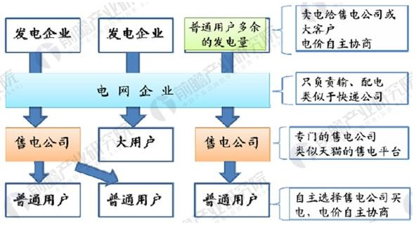 新電改之后,電力產(chǎn)業(yè)鏈主要特征是“放開兩頭,監(jiān)管中間”。其發(fā)電企業(yè)建立新的售電途徑,可直接賣電給大客戶,同時傳統(tǒng)向電網(wǎng)售電不變。中間環(huán)節(jié)電網(wǎng)公司只負(fù)責(zé)輸配電,成立專門售電公司,售電公司直接從電網(wǎng)購電出售給用戶,同時用戶也可自由選擇售電公司,使得電力交易更加深入市場化。