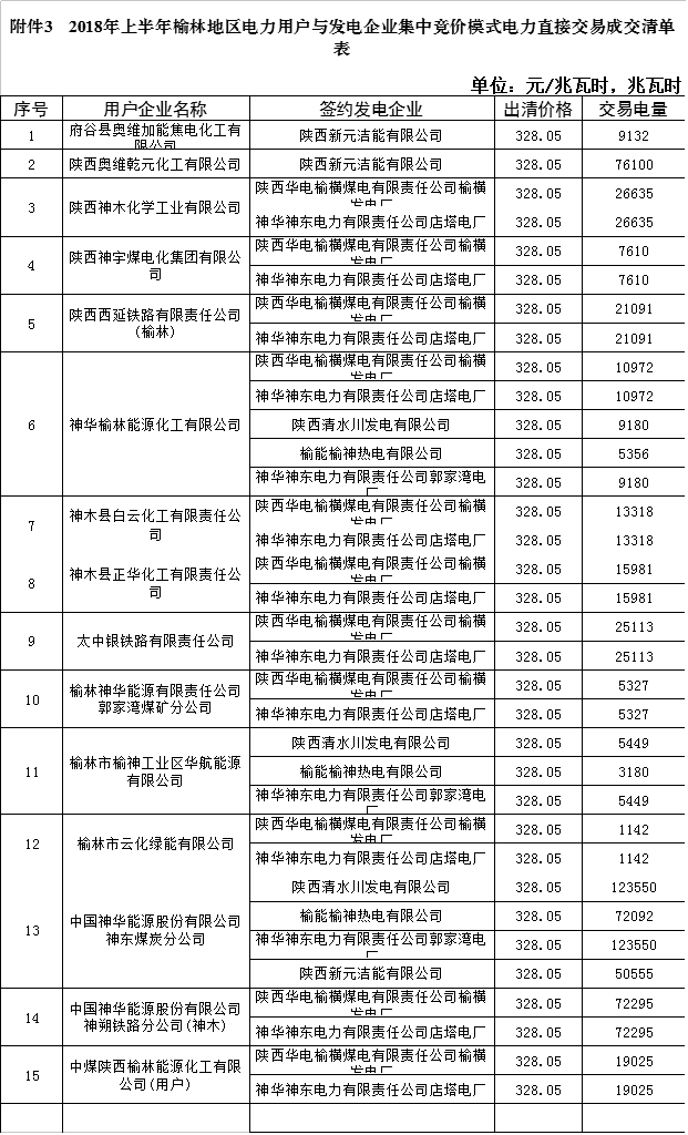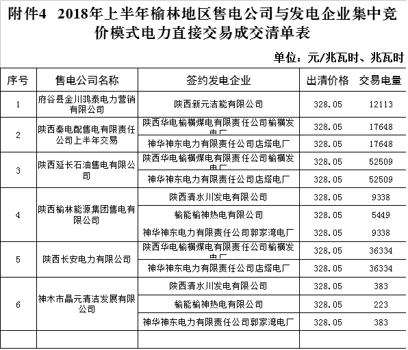 陜西省2018年上半年集中競(jìng)價(jià)模式電力直接交易成交結(jié)果:出清價(jià)格345.1元/兆瓦時(shí)(附清單)