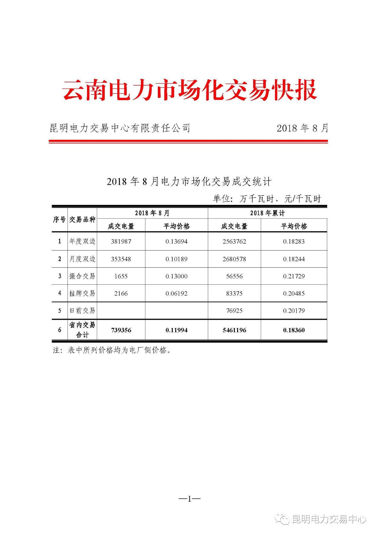 云南電力市場化交易快報(2018年8月)