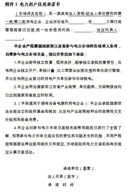 (二)擬參與江蘇電力市場(chǎng)交易的發(fā)電企業(yè)還需符合《江蘇省售電側(cè)改革試點(diǎn)實(shí)施細(xì)則》、《江蘇省電力中長(zhǎng)期交易規(guī)則》中的準(zhǔn)入條件,向江蘇電力交易中心簽署信用承諾書(shū)。