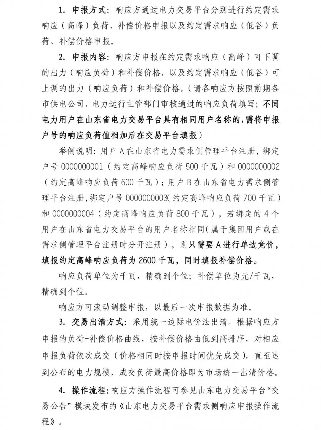 舉例說明:用戶A在山東省電力需求側(cè)管理平臺注冊,綁定戶號0000000001(約定高峰響應(yīng)負(fù)荷500千瓦)和0000000002(約定高峰響應(yīng)負(fù)荷600千瓦);用戶B在山東省電力需求側(cè)管理平臺注冊,綁定戶號0000000003(約定高峰響應(yīng)負(fù)荷700千瓦)和0000000004(約定高峰響應(yīng)負(fù)荷800千瓦),若綁定的4個用戶在山東省電力交易平臺的用戶名稱相同(屬于集團(tuán)用戶或在需求側(cè)管理平臺注冊時分開注冊),則只需要A進(jìn)行單邊競價,填報約定高峰響應(yīng)負(fù)荷為2600千瓦,同時填報補償價格。