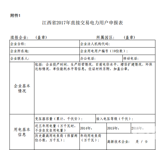 (一)園區(qū)申報(申報時間自通知下發(fā)之日起至 2017 年 4 月 15 日):由各設區(qū)市電力運行主管部門按園區(qū)為整體組織申報,于 4 月 15 日前將符合準入條件并有意向參與直接交易的園區(qū)審核匯總,正式行文報省能源局。