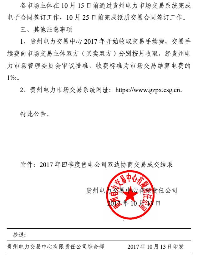 2017年10月14日,貴州電力交易中心發(fā)布公告,在2017年第四季度售電公司雙邊協(xié)商交易中,全省2家發(fā)電企業(yè)和3家售電公司提交9月份四季度雙邊協(xié)商交易意向,總成交電力2.54億千瓦時。
