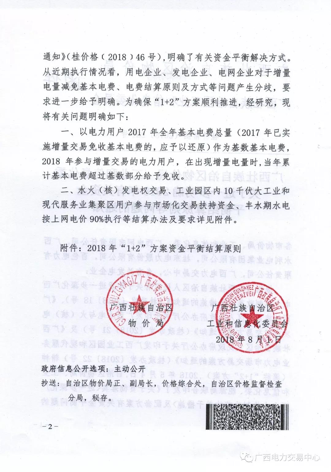廣西壯族自治區(qū)物價(jià)局、廣西壯族自治區(qū)工業(yè)和信息化委員會(huì)日前聯(lián)合發(fā)布了《廣西壯族自治區(qū)物價(jià)局 工業(yè)和信息化委關(guān)于關(guān)于進(jìn)一步明確2018年有關(guān)資金平衡結(jié)算原則等問題的通知(桂價(jià)格〔2018〕281號(hào))》,根據(jù)《廣西壯族自治區(qū)人民政府關(guān)于印發(fā)進(jìn)一步深化廣西電力體制改革若干措施的通知)(掛政發(fā)(2018)18號(hào))。廣西壯族自治區(qū)人民政府辦公廳關(guān)于印發(fā)廣西水電與火(核發(fā)電權(quán)交易方案的通知》(桂政辦發(fā)(2018)21號(hào))及《廣西壯族自治區(qū)人民政府辦公廳關(guān)于印發(fā)廣西工業(yè)園區(qū)和現(xiàn)代服務(wù)業(yè)電力市場交易方案的通知》(桂政辦發(fā)(2018)22號(hào))精神(簡稱“1+2”方案),2018年5月4日,自治區(qū)物價(jià)局、工業(yè)和信息化委、能源局聯(lián)合印發(fā)了《關(guān)于貫徹落實(shí)<進(jìn)一步深化廣西電力體制改革的若干措施》及配套方案有關(guān)資金平衡問題的通知》(桂價(jià)格(2018)46號(hào)),明確了有關(guān)資金平衡解決方式。從近期執(zhí)行情況看,用電企業(yè)、發(fā)電企業(yè)、電網(wǎng)企業(yè)對(duì)于增量電量減免基本電費(fèi)、電費(fèi)結(jié)算原則及方式等問題產(chǎn)生分歧,要求進(jìn)一步給予明確。為確保“1+2”方案順利推進(jìn),經(jīng)研究,現(xiàn)將有關(guān)問題明確如下: