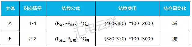 情景2:假設(shè)售電公司A將其持有的100MWh原始價格為300元/MWh的購電合約以315元/MWh元轉(zhuǎn)讓給售電公司B。實際發(fā)生的日前綜合電價為350元/MWh。該示例對應(yīng)表格中的2-3,2-4情景,查詢對應(yīng)公式,其結(jié)算如下: