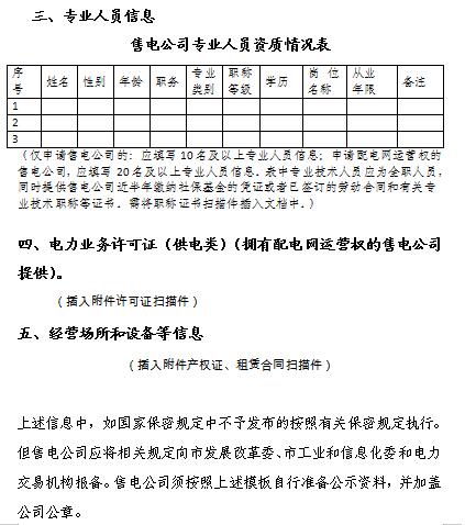 第三條 在其他電力交易機(jī)構(gòu)注冊(cè)的售電公司需按照天津市售電公司準(zhǔn)入條件補(bǔ)充以下材料:《授權(quán)委托書(shū)》、《售電公司信用承諾書(shū)》、《售電公司注冊(cè)申請(qǐng)書(shū)》、《售電公司注冊(cè)信息表》、《專(zhuān)業(yè)人員資質(zhì)表》,以及需要變更的《資產(chǎn)證明》、《經(jīng)營(yíng)場(chǎng)所證明文件》等,另需將《信用承諾書(shū)》、《注冊(cè)申請(qǐng)書(shū)》、《注冊(cè)信息表》、《專(zhuān)業(yè)人員資質(zhì)表》及需要變更的有關(guān)資料合并成一個(gè)文件(PDF格式,統(tǒng)一命名為“***售電公司天津公示材料”)。相關(guān)表格填報(bào)要求,見(jiàn)附件1到附件13。