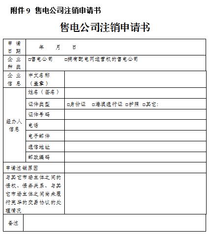 第九條 售電公司注冊(cè)信息的變更、注銷(xiāo)等事項(xiàng)均按照實(shí)施細(xì)則有關(guān)規(guī)定執(zhí)行,模板見(jiàn)附件8、附件9。