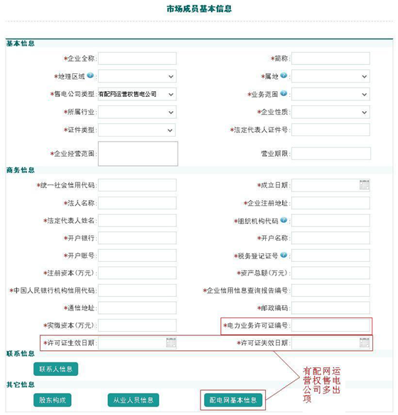 售電公司需要填寫(xiě)市場(chǎng)成員的基本信息,包括基本信息、商務(wù)信息、聯(lián)系信息等,打紅星的必填項(xiàng),不打紅星的為非必填項(xiàng),同時(shí)上傳相關(guān)附件信息。