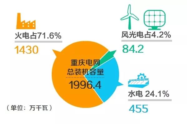 重慶電網(wǎng)直調(diào)發(fā)電廠分屬華能、國電投、大唐、國電、華電以及重慶能投,總裝機(jī)容量1996.4萬千瓦。其中,火電1430萬千瓦,占總裝機(jī)容量的71.6%,單機(jī)最大容量100萬千瓦; 水電455萬千瓦,占總裝機(jī)容量的24.1%,單機(jī)最大容量35萬千瓦;風(fēng)光電84.6萬千瓦,占總裝機(jī)容量的4.2%。