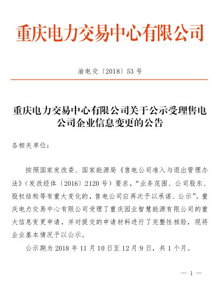 重慶電力交易中心日前發(fā)布了《關(guān)于公示受理售電公司企業(yè)信息變更的公告》,公示1家申請注冊信息變更的售電公司,公示期為2018年11月10日至12月9日,共一個月。