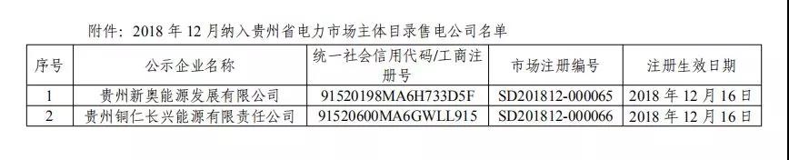 貴州關(guān)于公布2018年12月納入貴州省電力市場售電主體目錄企業(yè)名單的通知