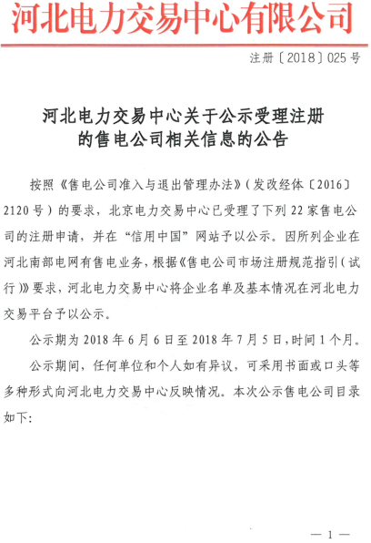 按照《售電公司準(zhǔn)入與退出管理辦法》的要求,北京電力交易中心已受理了下列22家售電公司的注冊(cè)申請(qǐng)。公示期為2018年6月6日至2018年7月5日,時(shí)間1個(gè)月。