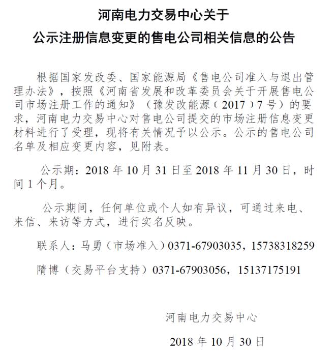 河南電力交易中心日前發(fā)布了《關(guān)于公示注冊信息變更的售電公司相關(guān)信息的公告(2018年10月31日)》,公示1家申請注冊信息變更的售電公司,公示期為2018年10月31日至11月30日,時間一個月。