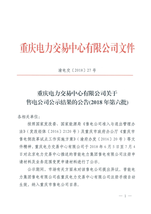 重慶電力交易中心今日發(fā)布了《重慶電力交易中心有限公司關(guān)于售電公司公示結(jié)果的公告(2018年第六批)》,北京推送的1家售電公司注冊生效。詳