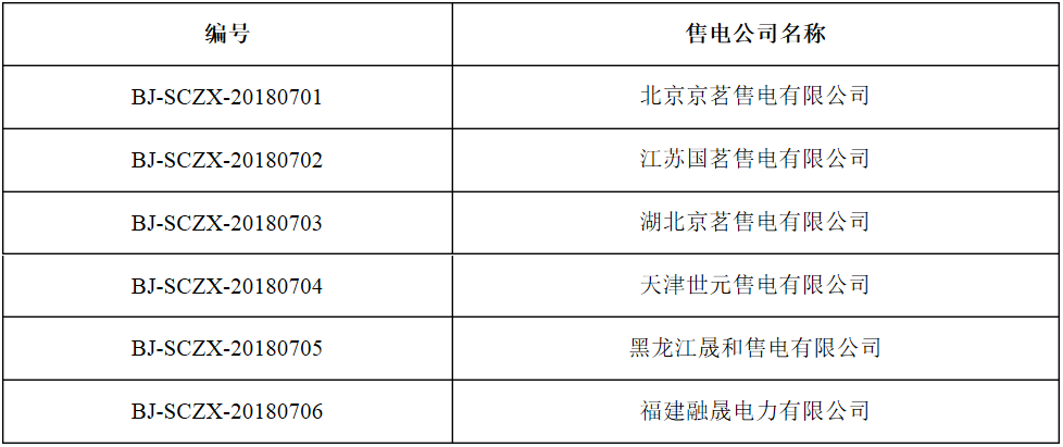 北京電力交易中心發(fā)布了《關于公示售電公司市場注銷的公告》的通知,北京京茗售電有限公司等6家公司由于企業(yè)自身原因,自愿退出電力市場,申請注銷在北京電力交易中心及北京電力交易中心推送的省(區(qū)、市)電力交易中心交易平臺的市場注冊。公示期為2018年7月16日至2018年7月27日,時間10個工作日。詳情如下: