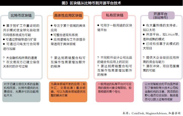 圖3顯示了過去幾年區(qū)塊鏈的多元化進程。目前,以“以太坊”為代表的開源平臺試圖克服第一代技術(shù)的諸多缺陷,開發(fā)多用途的應(yīng)用軟體。新發(fā)展方向包括解決“陌生人之間去信任”,允許用戶任意創(chuàng)建高級智能合約,實施去中心化的網(wǎng)絡(luò)交易關(guān)系管理。