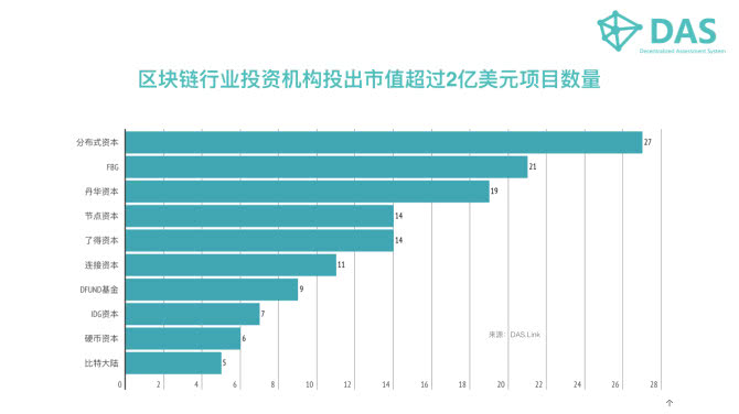 在傳統(tǒng)投資角度是比較樂于用“砸出多少獨角獸”這個指標來衡量一個機構的投資戰(zhàn)績的。在區(qū)塊鏈投資領域,我們以2億市值為一個衡量標準來觀察,發(fā)現分布式資本、FBG、丹華資本的戰(zhàn)績最優(yōu),分別投出了27個、21個和19個市值超過2億美元的項目。