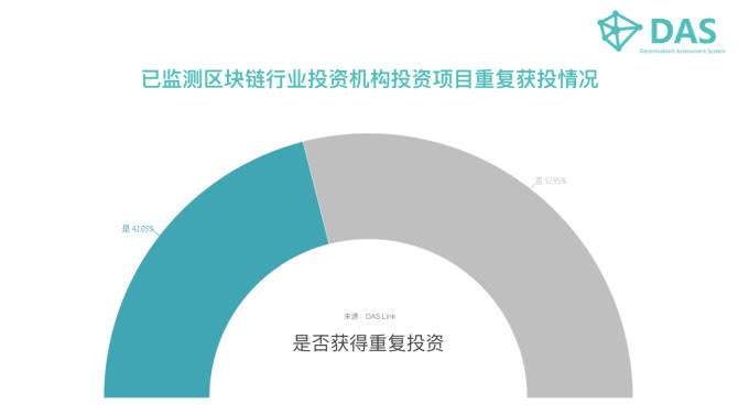 在已監(jiān)測的區(qū)塊鏈行業(yè)投資機構投資的項目當中,重復獲投的項目占42.05%。獲得重復投資的項目相對于其他項目而言對于機構更有吸引力,企業(yè)基本都能維持良好的運營狀態(tài),在2016、2017年間就有許多項目融資過程中出現搶份額的現象。