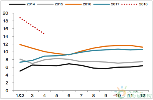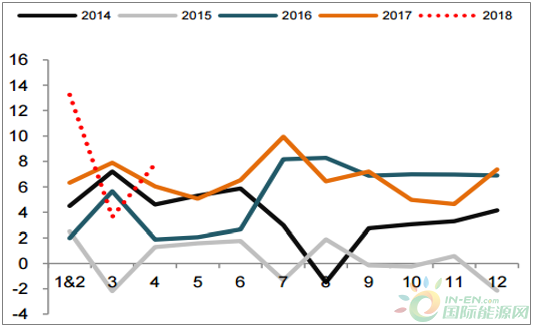2014-2018國內(nèi)月度用電量增速統(tǒng)計(百分比)