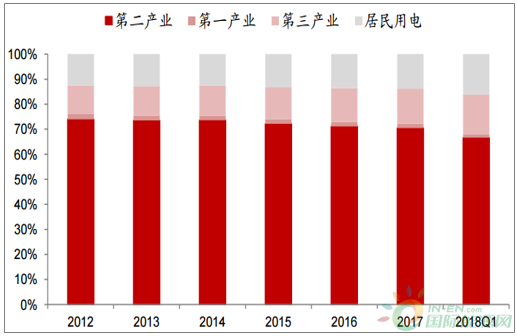 2012-2018Q1國內(nèi)細(xì)分產(chǎn)業(yè)用電量占比統(tǒng)計