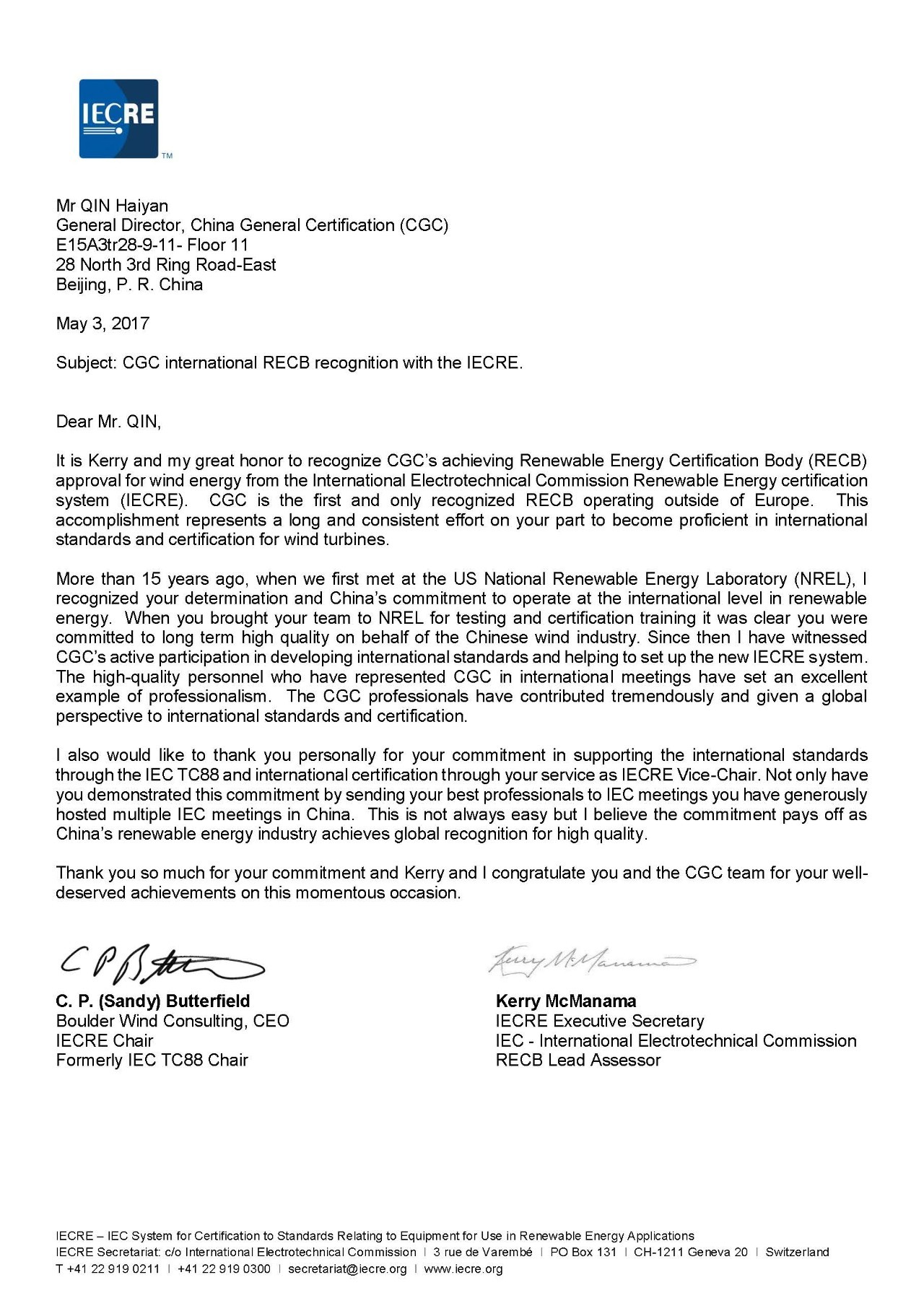 一帶一路國(guó)際合作高峰論壇召開之際,國(guó)際電工委員會(huì)可再生能源認(rèn)證體系(IECRE)主席Sandy Butterfield通過視頻發(fā)來致辭,對(duì)鑒衡認(rèn)證中心順利通過IECRE的現(xiàn)場(chǎng)評(píng)審及國(guó)家投票,成為歐洲外首家獲得IECRE官方認(rèn)可的認(rèn)