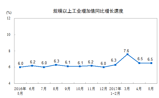 國家統(tǒng)計局發(fā)布的2017年5月份規(guī)模以上工業(yè)增加值增長6 5%數(shù)據(jù)顯示,與4月份持平。從環(huán)比看,5月份,規(guī)模以上工業(yè)增加值比上月增長0 51%;1-5月份,規(guī)模以上工業(yè)增加值同比增長6 7%。從同比看5月份,規(guī)模以上工業(yè)發(fā)