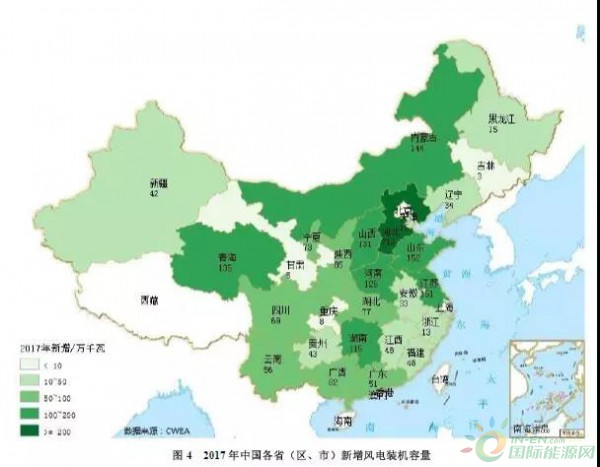2017年,中國六大區(qū)域的風電新增裝機容量所占比例分別為華北(25%)、中南(23%)、華東(23%)、西北(17%)、西南(9%)、東北(3%)。“三北”地區(qū)新增裝機容量占比為45%,中東南部地區(qū)新增裝機容量占比達到55%。
