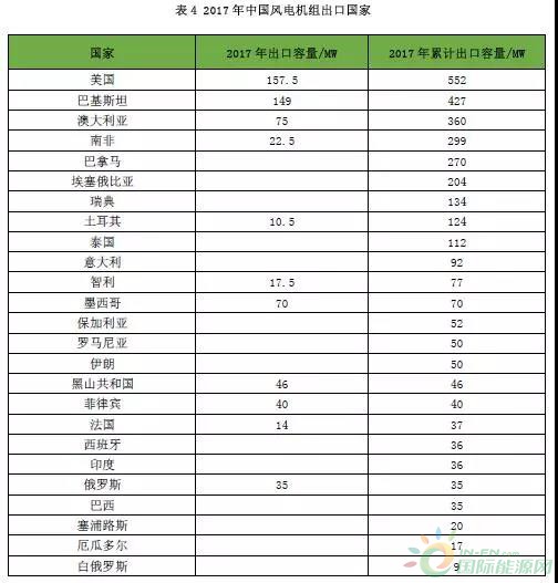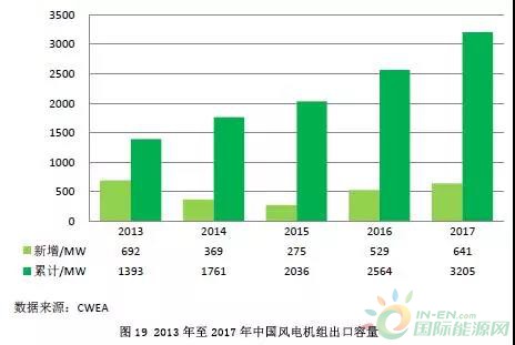 2017年,中國向國外出口風電機組311臺,容量641MW,同比增長21%。截至2017年底,中國風電機組制造企業(yè)已出口的風電機組共計1707臺,累計容量達到3205MW。