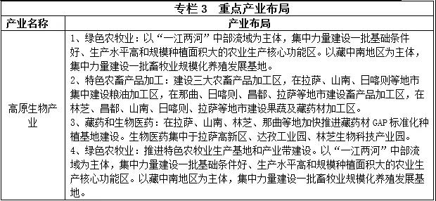 ——產(chǎn)業(yè)集聚度明顯提高,產(chǎn)業(yè)布局更加合理。各類產(chǎn)業(yè)園區(qū)、基地基礎(chǔ)設(shè)施建設(shè)日益完善,基本建成布局合理、功能齊全、經(jīng)濟(jì)繁榮的藏中南經(jīng)濟(jì)帶,藏東、藏北、藏西特色優(yōu)勢產(chǎn)業(yè)加快發(fā)展,高原特色農(nóng)產(chǎn)品基地、藏民族特色文化產(chǎn)業(yè)發(fā)展基地、開發(fā)開放實(shí)驗(yàn)區(qū)、經(jīng)濟(jì)合作區(qū)、綜合保稅區(qū)等產(chǎn)業(yè)集聚區(qū)等建設(shè)成效顯著。