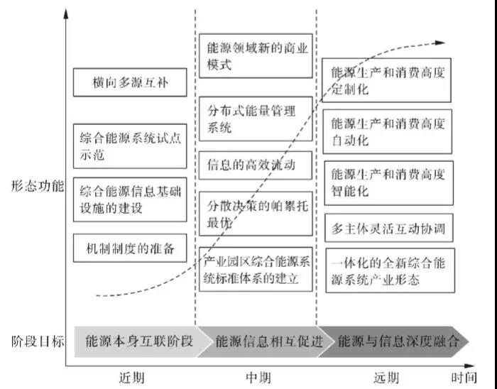未來產(chǎn)業(yè)園區(qū)綜合能源系統(tǒng)將以互聯(lián)網(wǎng)深度應(yīng)用為基礎(chǔ),以電力系統(tǒng)為核心,將供氣系統(tǒng)、供熱系統(tǒng)與電力系統(tǒng)等集成,橫向角度實現(xiàn)電力、燃?xì)狻⒐岬纫惑w化多能互補(bǔ),縱向角度實現(xiàn)源網(wǎng)荷儲全環(huán)節(jié)高度協(xié)調(diào)與靈活互動、集中化與分布式相互結(jié)合的能源網(wǎng)絡(luò)。不論是單一的電力互聯(lián),還是能源領(lǐng)域演變產(chǎn)生的創(chuàng)新商業(yè)模式,亦或是互聯(lián)網(wǎng)思維與技術(shù)對能源工業(yè)的改造升級,都是多能互補(bǔ)綜合能源系統(tǒng)中的不同發(fā)展階段中的應(yīng)有要素。本質(zhì)上而言,產(chǎn)業(yè)園區(qū)綜合能源系統(tǒng)的發(fā)展是能源與信息不斷融合以及互相促進(jìn)的歷程,是一個漸進(jìn)的發(fā)展過程。綜合我國能源和信息基礎(chǔ)設(shè)施及能源市場等方面的現(xiàn)有條件,產(chǎn)業(yè)園區(qū)綜合能源系統(tǒng)演化路線圖如圖6所示。隨著時間推移,產(chǎn)業(yè)園區(qū)綜合能源系統(tǒng)大概可以分為近期、中期和遠(yuǎn)期3個發(fā)展階段。本質(zhì)上而言,這3個發(fā)展階段是一個同步發(fā)展、相互滲透和逐級遞進(jìn)的過程。3個階段的發(fā)展目標(biāo)和功能分別闡述如下。