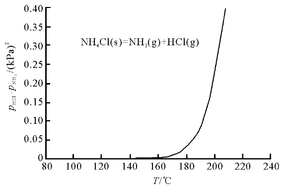 基于對(duì)應(yīng)態(tài)原理計(jì)算氯化氫和氨氣的逸度系數(shù),并根據(jù)化工熱力學(xué)數(shù)據(jù)手冊(cè)將氣態(tài)氯化氫、氣態(tài)氨氣以及固態(tài)氯化銨的代入上式,得到氯化銨結(jié)晶反應(yīng)達(dá)到平衡時(shí),溫度與氣態(tài)反應(yīng)物分壓的關(guān)系。