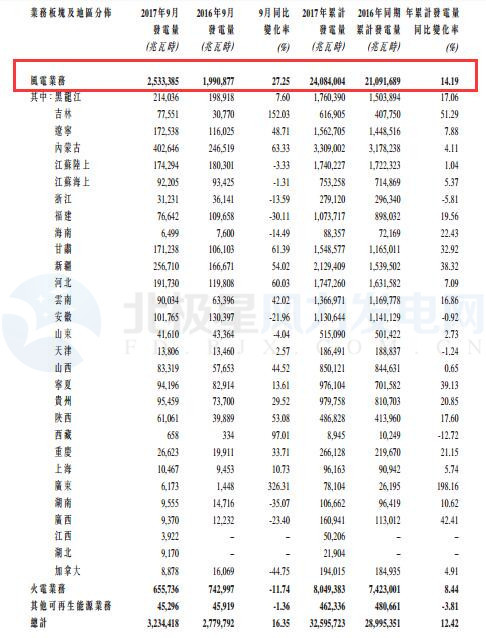 截至2017年9月30日,龍源電力2017年累計完成發(fā)電量325.96億千瓦時(32,595,723兆瓦時),同比增加12.42%。其中,風電累計發(fā)電量240.84億千瓦時(24,084,004兆瓦時),同比增加14.19%,其他可再生能源發(fā)電量減少3.81%。