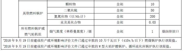 2016年9月19日前建成投產(chǎn)或環(huán)境影響評(píng)價(jià)文件已通過(guò)審批的燃煤鍋爐,2016年12月31日前建成投產(chǎn)或環(huán)境影響評(píng)價(jià)文件已通過(guò)審批的燃油、燃?xì)忮仩t或燃?xì)廨啓C(jī)組及其他燃料鍋爐,自本標(biāo)準(zhǔn)實(shí)施之日起至2019年12月31日止,不分控制區(qū)執(zhí)行表1中的排放濃度限值。