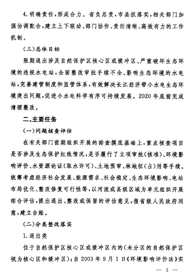 總體目標(biāo):限期退出涉及自然保護(hù)區(qū)核心區(qū)或緩沖區(qū)、嚴(yán)重破壞生態(tài)環(huán)境的違規(guī)水電站,全面整改審批手續(xù)不全、影響生態(tài)環(huán)境的水電站,完善建管制度和監(jiān)管體系,有效解決長江經(jīng)濟(jì)帶小水電生態(tài)環(huán)境突出問題,促進(jìn)小水電科學(xué)有序可持續(xù)發(fā)展。2020年底前完成清理整改。