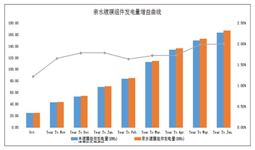 對(duì)兩塊組件進(jìn)行長(zhǎng)期的戶(hù)外功率跟蹤測(cè)試,測(cè)試過(guò)程中不對(duì)測(cè)試組件進(jìn)行清洗,對(duì)比兩塊組件的發(fā)電量,得出如下親水鍍膜組件相對(duì)常規(guī)組件的功率增益曲線。綜合不同季節(jié)的發(fā)電量測(cè)試數(shù)據(jù),親水鍍膜組件相對(duì)于常規(guī)組件的發(fā)電量增益均值為2%。