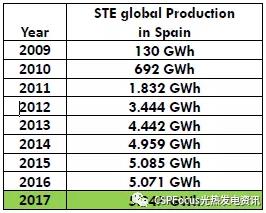2009-2017年西班牙光熱電站發(fā)電量(來源:LuisCrespo,Protermosolar,2018)