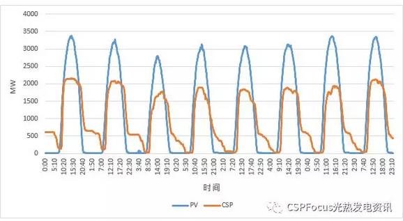 在白天用電高峰期,光熱發(fā)電通過約一個小時左右的啟動準備后即可保證穩(wěn)定的輸出,直到日落。而光伏的發(fā)電則與光照強度基本呈正相關,二者的發(fā)電特點完全不同。