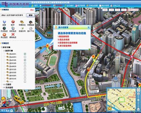 3、可對供電局裝有GPS設備的車輛和工作人員進行定位。并計算出到客戶的距離和手中的任務,方便監(jiān)督搶修、巡線、抄表、用電檢查等工作。