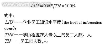 因?yàn)槠髽I(yè)信息化的主體是企業(yè)信息資源的使用者,即企業(yè)所有員工,所以企業(yè)員工知識(shí)水平對(duì)企業(yè)信息化評(píng)價(jià)有重大意義。員工知識(shí)水平的指標(biāo)由企業(yè)學(xué)歷在大專(zhuān)以上的員工人數(shù)與企業(yè)員工總數(shù)之比來(lái)反映。計(jì)算公式如下: