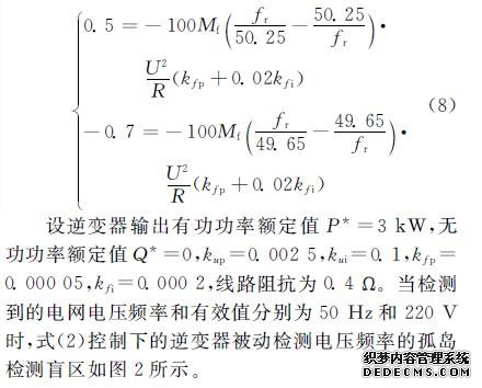 文獻(xiàn)[8]規(guī)定,若逆變器輸出電壓頻率在49.3~50.5Hz范圍內(nèi),則2s內(nèi)必須檢測出孤島。對(duì)應(yīng)式(7),有2種情況: