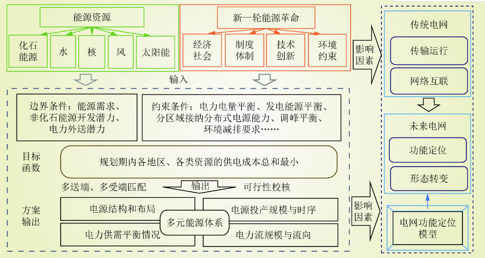 (2)未來電網(wǎng)形態(tài)的演變,受到能源電力系統(tǒng)內(nèi)部和外部經(jīng)濟(jì)、體制、環(huán)境等因素共同影響。未來中國電網(wǎng)功能將顯著提升,既要滿足能源電力大規(guī)模遠(yuǎn)距離輸送的需要,又要滿足受端地區(qū)多種能源電力協(xié)同運(yùn)行的需要,還要滿足新能源發(fā)展和新型用電服務(wù)的需要。
