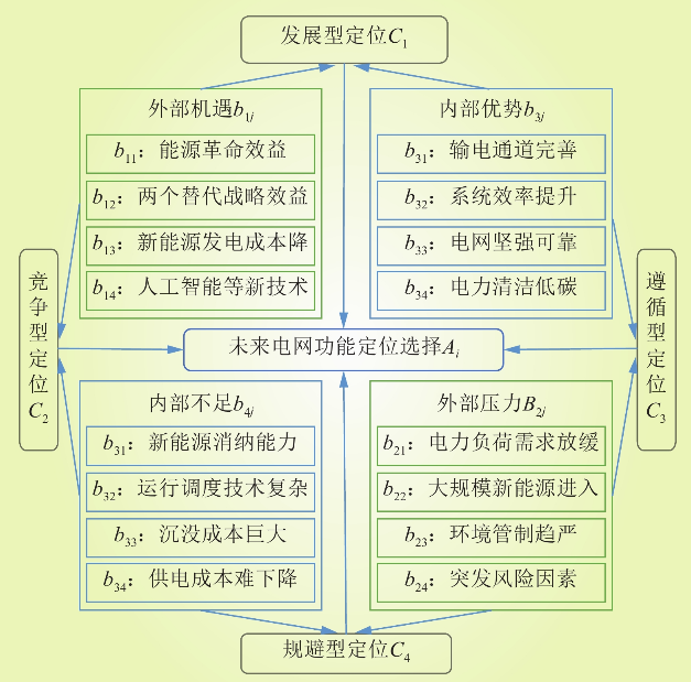 摘要:新一輪能源革命下電網(wǎng)的發(fā)展將在電力系統(tǒng)傳統(tǒng)功能基礎(chǔ)上進(jìn)一步擴(kuò)展和豐富。在對(duì)新一輪能源革命內(nèi)涵的深刻剖析基礎(chǔ)上,借助電力系統(tǒng)優(yōu)化規(guī)劃模型對(duì)未來多元能源供應(yīng)系統(tǒng)進(jìn)行探索,預(yù)判未來能源發(fā)展格局。結(jié)合技術(shù)、經(jīng)濟(jì)、制度、環(huán)境等因素,識(shí)別影響電網(wǎng)發(fā)展的關(guān)鍵因素,通過構(gòu)建電網(wǎng)功能定位模型,運(yùn)用SWOT-AHP分析電網(wǎng)發(fā)展的內(nèi)外部環(huán)境,構(gòu)建相應(yīng)的指標(biāo)體系量化分析電網(wǎng)發(fā)展的戰(zhàn)略定位,提出電網(wǎng)功能與形態(tài)轉(zhuǎn)變的方向。結(jié)果表明,未來電網(wǎng)的電力傳輸功能向更大容量、更安全、更智能的方向發(fā)展,并呈現(xiàn)綜合能源互聯(lián)互補(bǔ)的高級(jí)形態(tài),電網(wǎng)將為社會(huì)提供多元化、立體式、智能化服務(wù)。