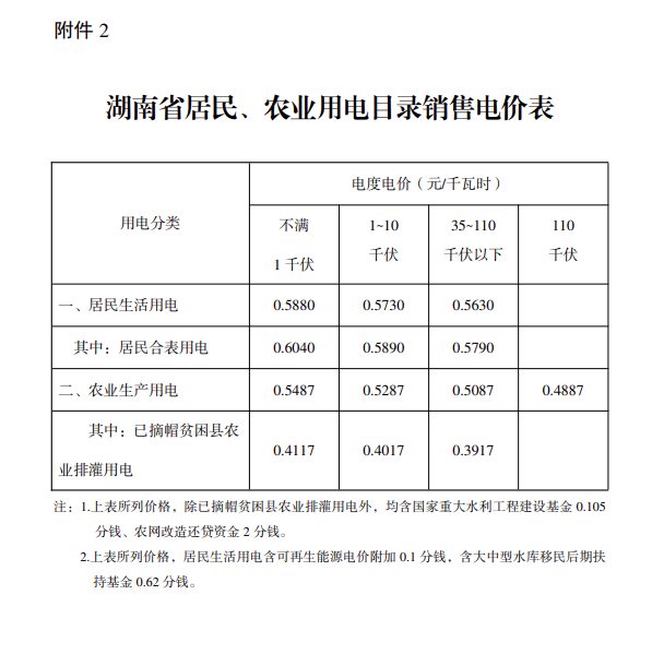 2.湖南省居民、農(nóng)業(yè)用電目錄銷售電價(jià)表
