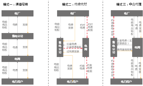 在這種模式下,電能作為商品,其物權從電廠到售電公司再到電網最終到電力用戶(物權流向取決于合同契約,與實際物流方向可以分離,電流方向仍然是電廠到電網再到用戶),售電公司出資向電廠采購電量,再賣給電網,電網最終賣給電力用戶,收取電費。物權流向與資金流方向相對,發(fā)票流向與物權流向方向相同,所有應付的服務費、手續(xù)費都可以折算在上下游之間的差價里。