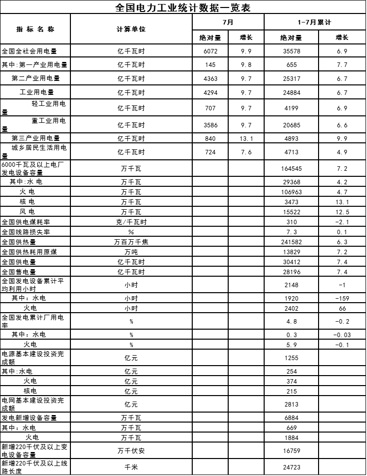 在國家能源局官網(wǎng)獲悉,1-7月份全國電力工業(yè)統(tǒng)計數(shù)據(jù)發(fā)布。1-7月,全國全社會用電量35578億千瓦時,增6 9%。全國售電量28196億千瓦時,增7 4%。