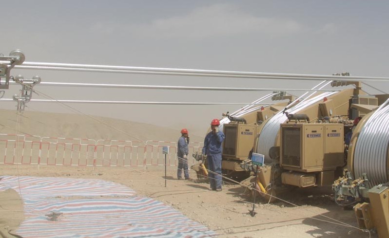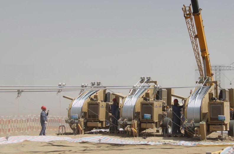 本次導(dǎo)線展放是六分裂1000平方毫米大截面積導(dǎo)線在特高壓工程中的首次應(yīng)用。自4月1日工程放線工作開(kāi)始,承建該工程寧夏段的寧夏送變電工程公司克服了寧夏地區(qū)風(fēng)沙大、施工環(huán)境惡劣、青賠難度大等困難,在施工水平和施工管理上發(fā)揮了寧電鐵軍一貫作風(fēng),組織專業(yè)力量對(duì)施工機(jī)具、方案編制、工藝流程進(jìn)行了精心研究,在全國(guó)特高壓直流輸電線路工程建設(shè)中首次采用“二牽六”架線施工方法。“二牽六”放線施工機(jī)械化作業(yè)程度高,可同步展放6根1000平方毫米大面積導(dǎo)線,滑車懸掛方式簡(jiǎn)單,六根子導(dǎo)線在同一滑車內(nèi)緊線不易因滑車邁步產(chǎn)生子導(dǎo)線尺度差異。