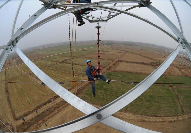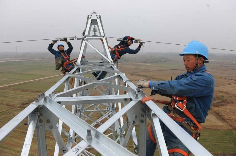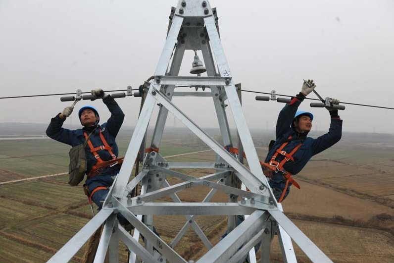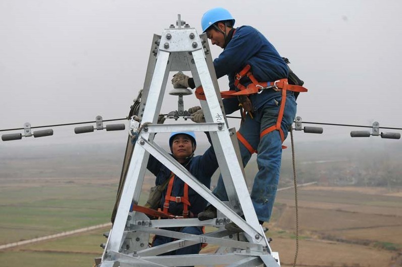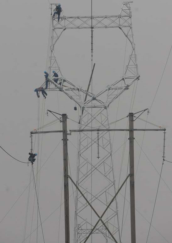 在安徽省定遠(yuǎn)縣池河鎮(zhèn)劉鋪村,國(guó)家電網(wǎng)安徽滁州供電公司的電力工人在50多米的高空冒著細(xì)雨進(jìn)行架線作業(yè)。當(dāng)日,隨著鳳(陽(yáng))定(遠(yuǎn))2858輸電線路的最后一根架空導(dǎo)線架設(shè)完成,安徽省滁州電網(wǎng)迎峰度冬7號(hào)工程—