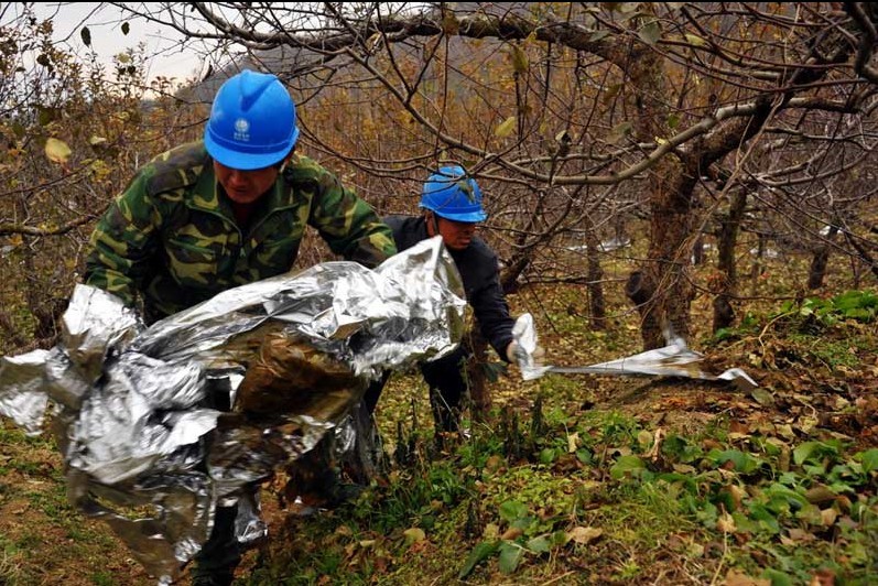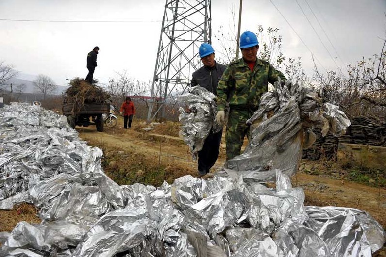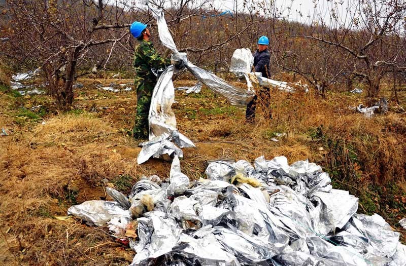 棲霞藏家莊鎮(zhèn)村民在自家的 蘋果園里,收集大量的反光膜。